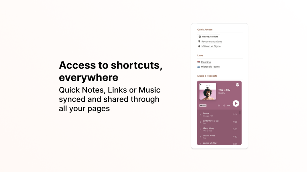 Music Shortcut: Need some background music while studying? Enjoy a built-in shortcut to listen to your favorite music directly within Notion. Stay focused while getting inspired by your favorite tracks.